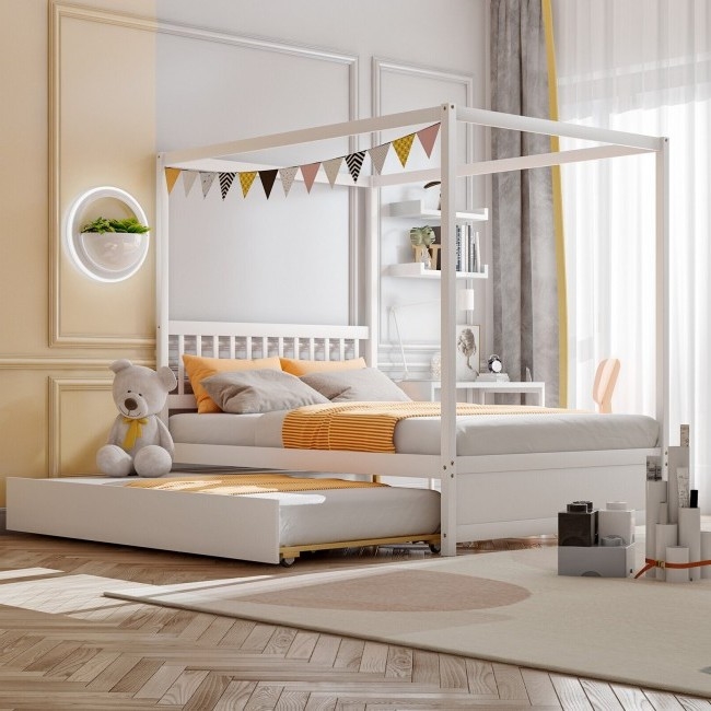 Home > White Full Size Canopy Platform Bed with Twin Roller Trundle Bed