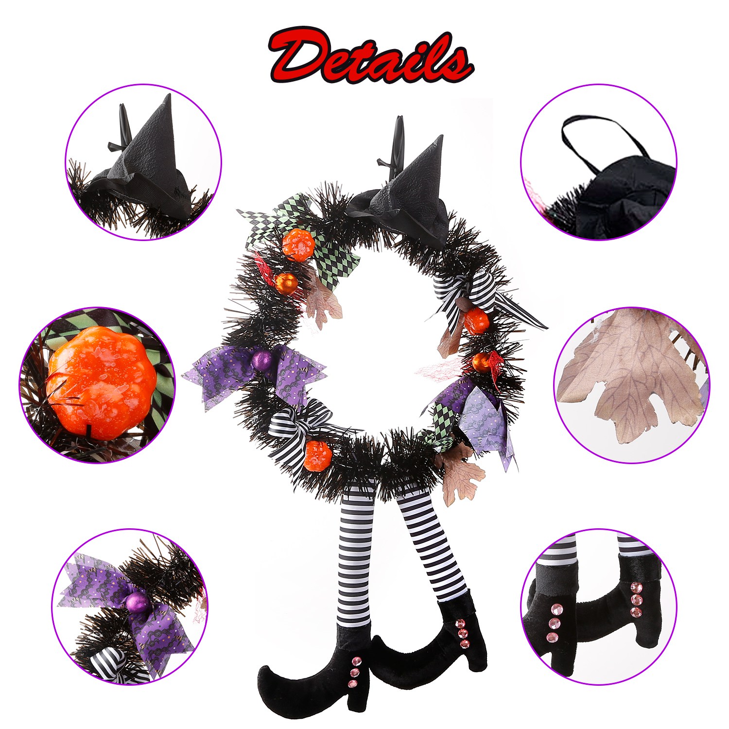 Home > Halloween Witch Wreath Pumpkin Door Decorations Artificial Party Hanging Handmade Wreath Garland with Hat Legs for Front Door Indoor Wall Decoration