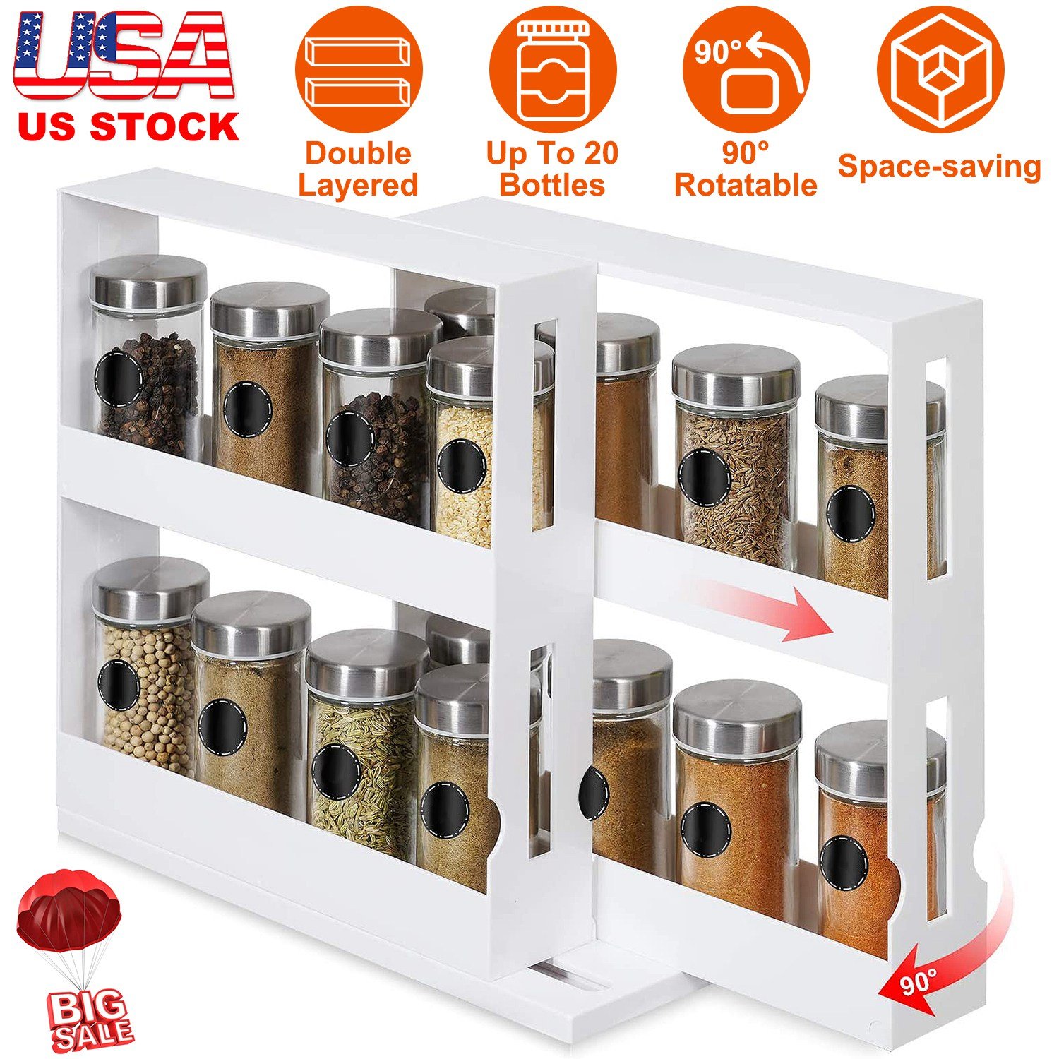 This is a modular, instant-access, and pull-and-rotate organizer, which takes up the most of vertical space. Maximize tidiness in tight space and find what you want whenever you need it. Double-decker shelves fit different-sized containers, including spices, medicines, cosmetics, etc..