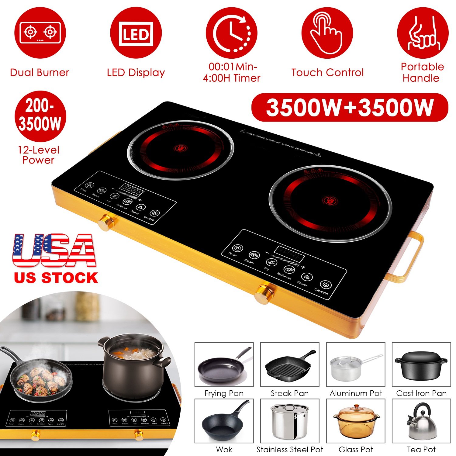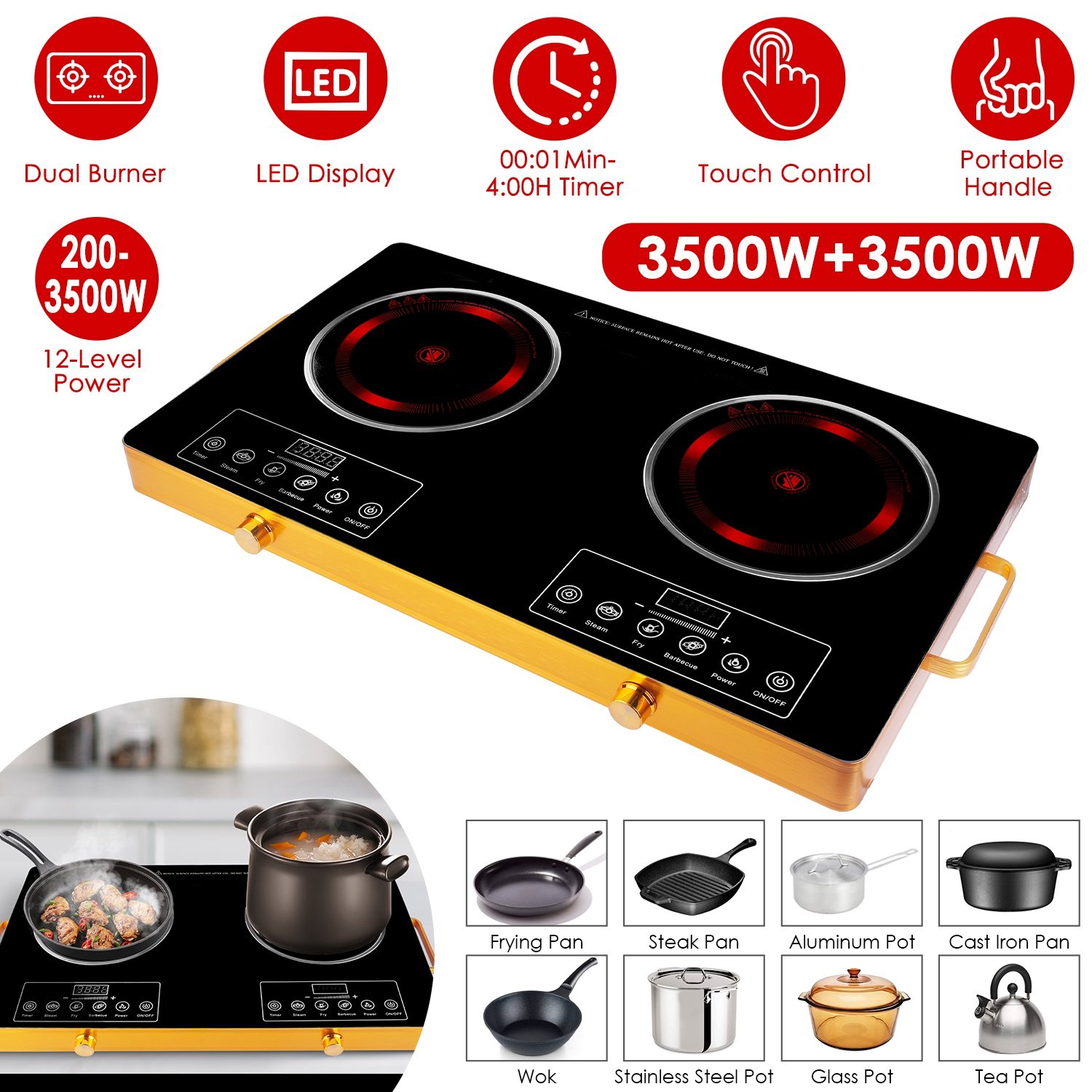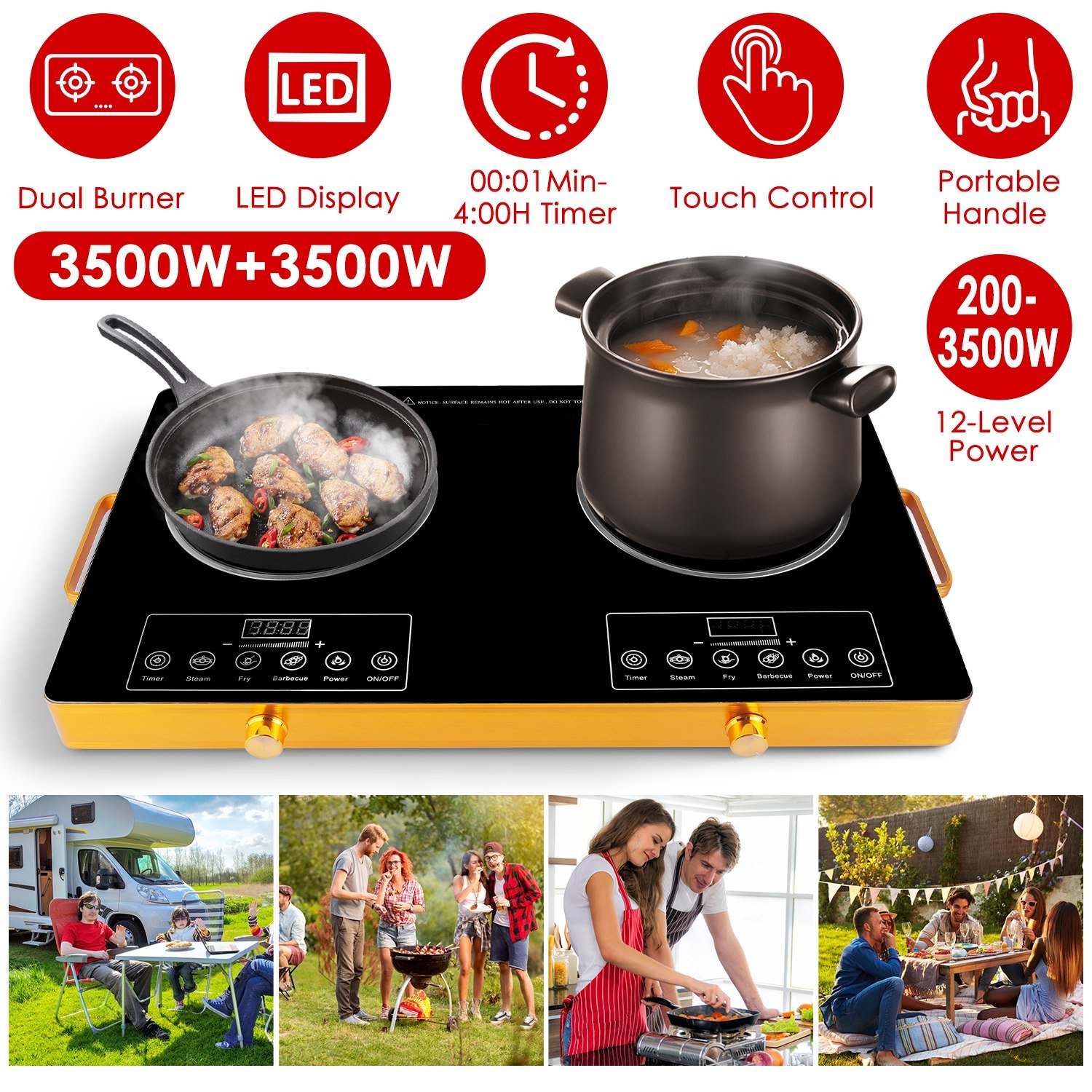 This powerful 110V dual-burner cooktop delivers rapid 3500W+3500W heating for fast boiling and searing, featuring four preset cooking modes (Steam, Fry. Barbecue, Power) for convenience and 11 precise power levels for versatile control. Includes a handy 0-4 hour timer and overheat protection for safety cooking. Its portable design with handles and sturdy heat-resistant glass surface makes it ideal for dorms, RVs, and camping, while wide compatibility works with most flat-bottomed cookware.