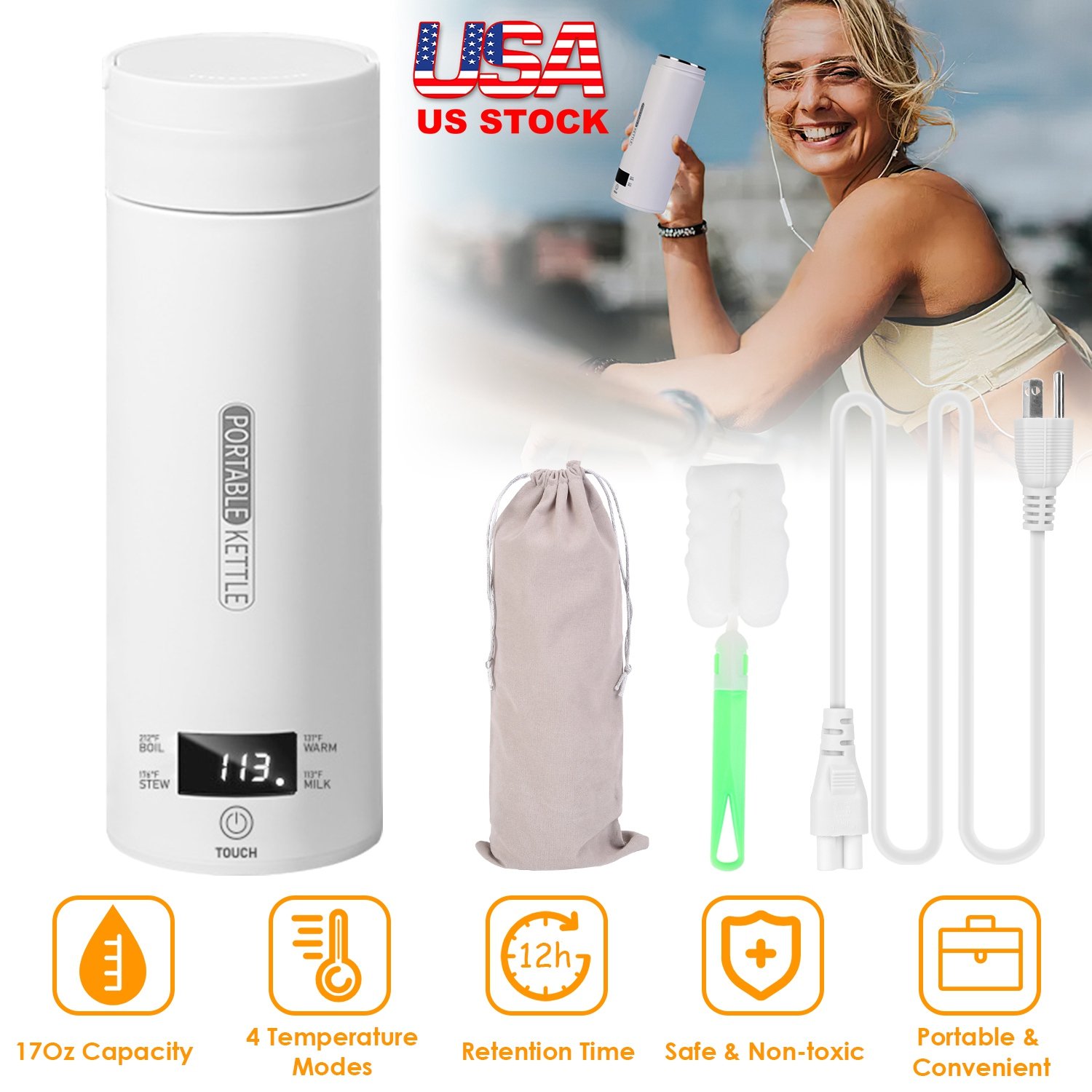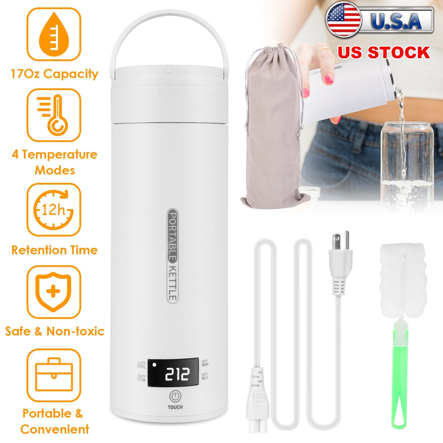 Looking for a portable electric kettle that allows you to take it anywhere? Featured with 4 preset modes(113/131/176/212), our electric kettle allows you to enjoy any hot or warm beverages, fully satisfying your drinking preferences. One button control, easy to operate. The LCD display also enables you to know the exact heating temperature. Keep drinks stay at the desired temperature for 12 hours in the plug-in state and 2 hours in the unplugged state. Made of with PP and 316 stainless steel, safe, non-toxic and leak-proof. The 500ml/17Oz capacity and the inbuilt handle make the kettle the right size for you to carry and drink from throughout the day. A perfect companion for home, office and travel.