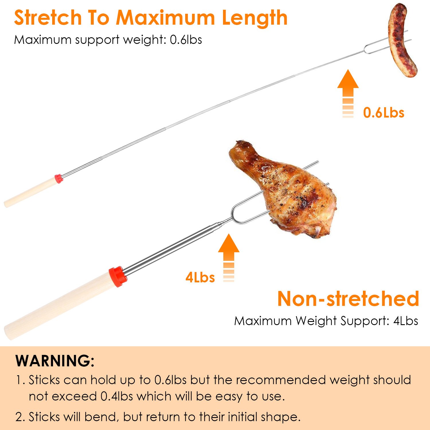 Our roasting stick set is convenient to carry out for barbecue or leisure in the garden. This roasting fork stick is specially designed for light weight food such as marshmallows, fish balls, sausages, tomatoes, onions and vegetables. The fork tip is flat and not easy to hurt people. The color ends of the handles make each one easy to identify as "Mine". Extendable roasting stick is the safest solution for kids to participate at cooking in patio fire pit. Stainless steel material is easy to clean and long lasting use.