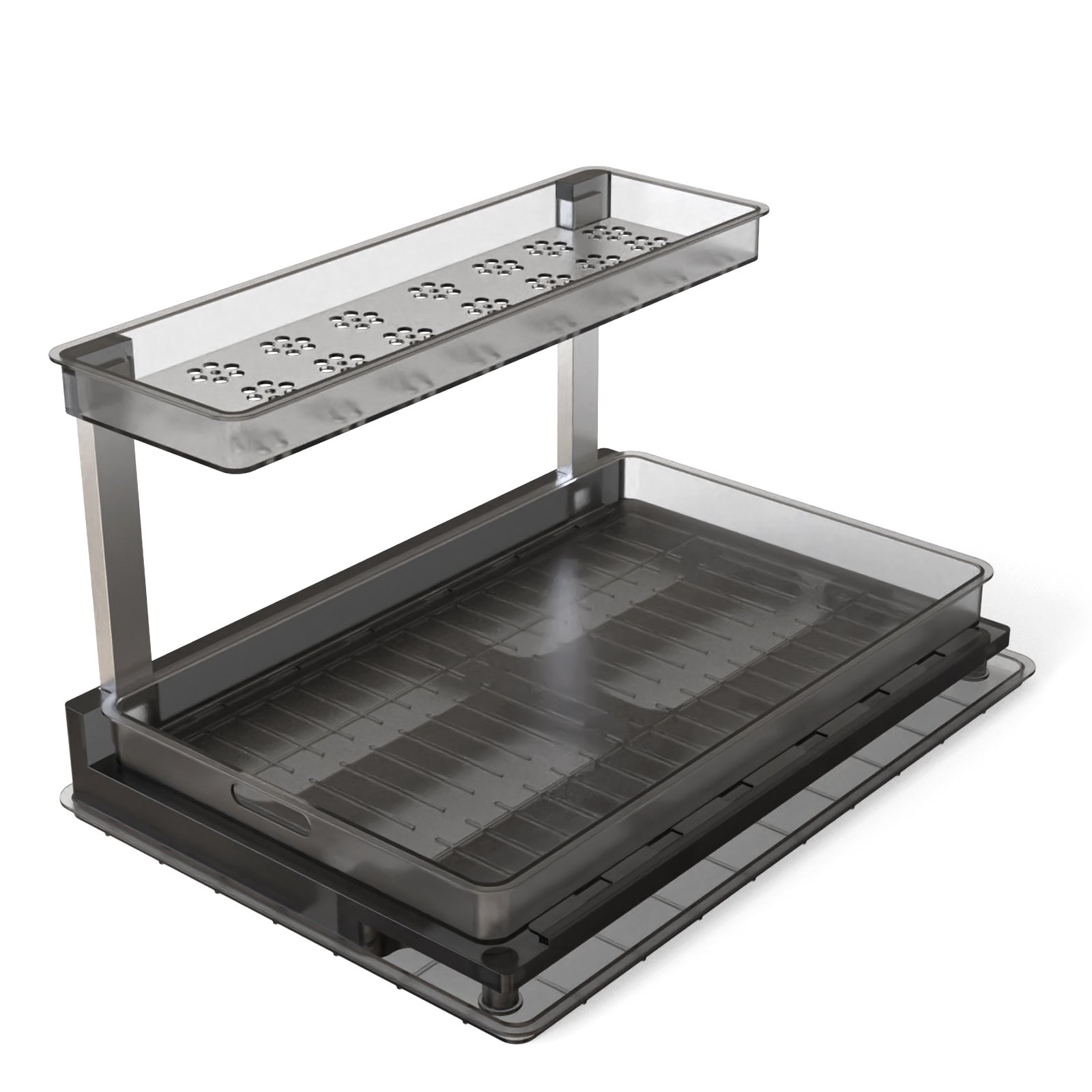 Our 2-tier under-sink organizer maximizes storage space with its unique L-shaped design, efficiently use vertical space while fitting snugly around plumbing fixtures. Perfect for storing cleaning supplies in various locations like bathrooms, kitchens, food pantries, and offices. The upper fixed basket keeps smaller items easily accessible while the bottom sliding-out basket allows effortless access to heavier essentials from both sides. Constructed of thickened PET material, stainless steel pipes, it's sturdy, rustproof, and has great loading capacity. Additionally, the top basket features hollow design providing excellent drainage. The assembly process is rapid and tool-free, use stainless steel pipes to connect the upper basket with base and insert the drawer tray, instant setup within minutes.